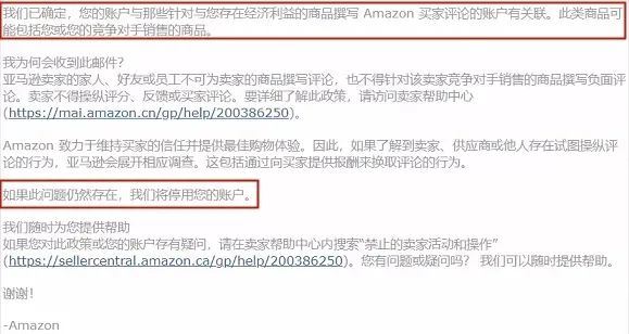 亚马逊在此警告信的下方还提到:“如果此问题仍然存在,我们将停用您的账户。”