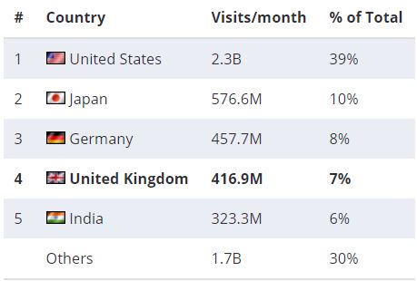亚马逊英国站4.17亿的月活量足以说明英国人民对其的喜爱程度。英国站点在亚马逊各大站点中排名第四,仅次于美国、日本和德国站。亚马逊全球GMV估值为3350亿美元。