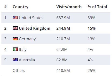 亚马逊和eBay占据英国消费市场的主导地位。亚马逊和eBay英国站点的月活量分别是4.17亿和2.45亿,要知道,英国的人口不过6800万。值得注意的是,eBay英国站的流量是亚马逊英国站的的59%,而在美国,eBay的流量只有亚马逊1/4,表明eBay英国站的竞争力和存在感明显比本部所在—美国(站)更胜一筹。