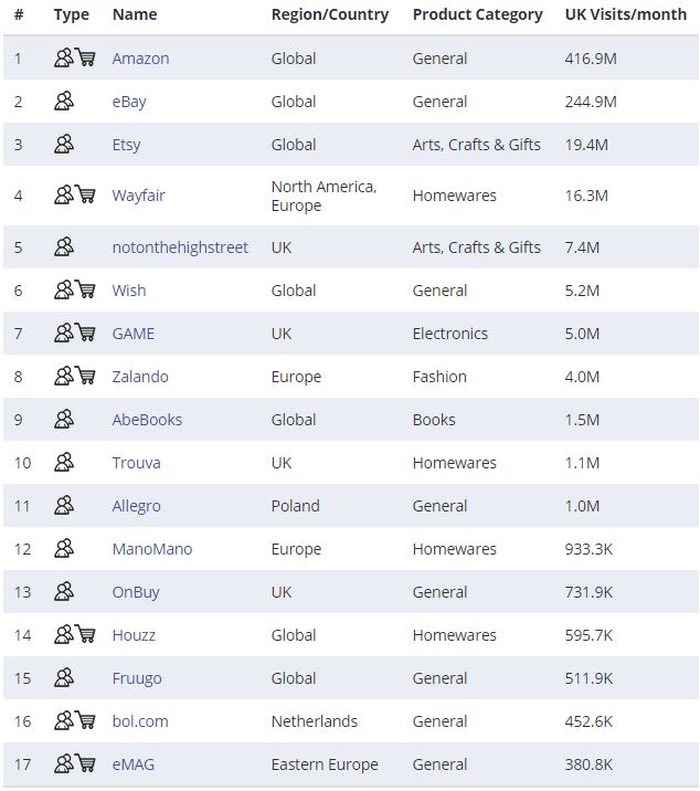英国也是世界上电子商务最发达的市场之一,网上销售额占英国零售总额的19%。这远远领先于美国(美国的在线零售占总销售额的比例不到12%)。欧洲的电商市场可是说是百家争鸣,星罗棋布,前有Allegro“闪电攻陷”波兰,后有bol.com“再次统一”荷兰和比利时,除了出没在全球市场的亚马逊和eBay,活跃在欧洲境内的电商平台尤为显著的特点就是,以国家原点,“割据势力范围”,大部分的本土电商能够辐射的范围仅限邻国和共享历史渊源的周边国家,以上这些共性,在英国也可以看到。亚马逊和eBay在英国都设有站点,eBay在美国“大势已去”但万年老二的位置在英国坐得稳妥许多,Wish、Etsy等全球上线的电商在英国也有不俗的市场流量,另外还有一些在欧洲其他国家极度活跃但在英国存在感不强以及英国本土电商平台的盘点。
