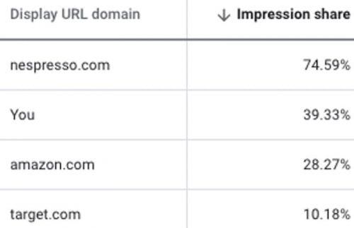 如下图,我的广告展示份额为39.33%,Nespresso的数值是我的两倍,为74.59%,亚马逊(28.72%)和target(10.18%)的比例则更低。竞争对手由谷歌自动选择,广告商不能自主选择。