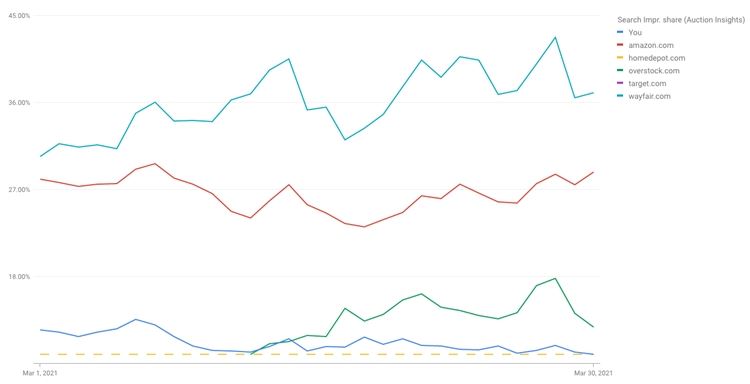 下图是我的账户在2021年3月与竞争对手的展示份额图表。与竞争对手亚马逊、Homedepot、Overstock、Target和Wayfair相比,我的展示份额(图中底部的蓝线)相对较低。