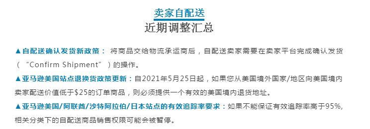 大家也知道,如果暂停销售或者封号会造成严重的损失,卖家在后续发货时就需要相应的做一些调整。亚马逊为了方便统计这个有效追踪率,才会发布新的自配送政策:要求卖家在“卖家平台”完成“确认发货”操作;完成这个操作。