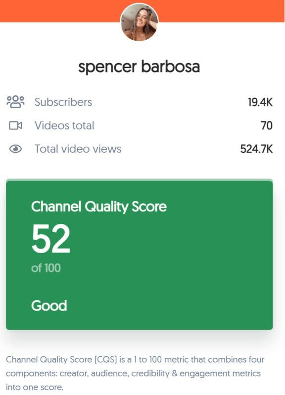 通常需要借助工具(amz.fun/UStxX)来查询网红的内容质量,我简单搜索了YouTube上的一个小网红,它给这个网红的内容打分52分,等级是Good。